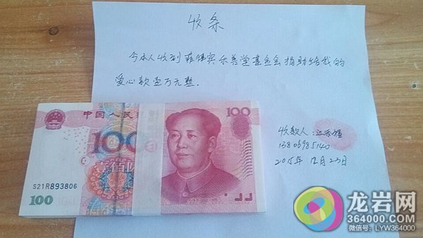 12月16日, 龙岩网报道《父早逝母眼瞎女儿年幼妻子出走 祸不单行的江添福患白血病求助》,经龙岩网联系,救急扶伤的菲律宾乐善堂慈善基金会(以下简称:乐善堂)开会决定捐助一万元爱心款给江添福。12月23日,龙岩网转交乐善堂的一万元爱心款给患者。患者及家属非常感谢乐善堂的慷慨救助!